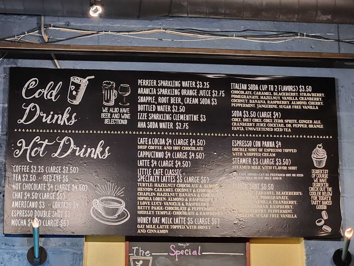 The menu offers a variety of options organized into distinct groups to accommodate different dining preferences and times of day. For beverages, there's a selection of hot drinks including coffee, tea, espresso-based options such as Americano, Cortado, Mocha, and specialty drinks like Chai and Hot Chocolate. Prices for these beverages range from around US$2.25 to US$5.00.
