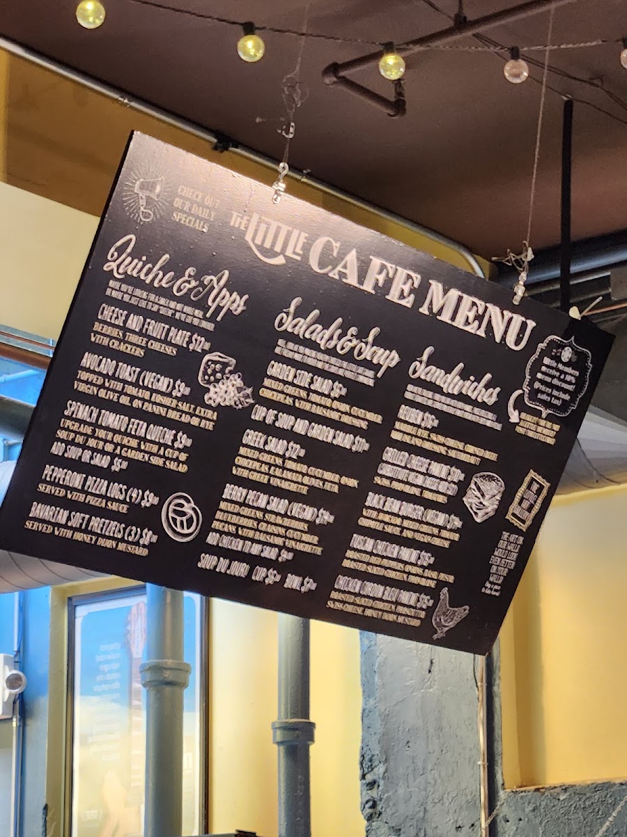 Food selections include light bites and small plates categorized under Quiche & Apps, featuring items like Cheese and Fruit Plates, Avocado Toast, and Bavarian Soft Pretzels. Other food choices consist of various salads such as Garden Side Salad, Greek Salad, and combination offerings like Cup of Soup and Garden Salad.